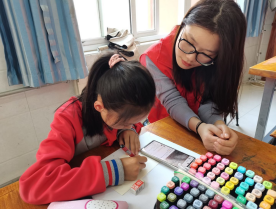 13点30分,志愿队全体成员在校内集结完毕,徒步前往美盛小学。午14点20分,小朋友们带着童真的稚气,陆续进入教室,志愿队的大朋友们已早早等候在教室里,备着七彩颜料欢迎小朋友们。