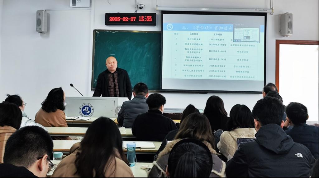 石永松副院长全面解读《中华人民共和国学位法》,石院长首先追溯了学位法的立法背景,详细回顾其修订历程中的关键节点,使大家清晰知晓这部法律从孕育到完善的全过程。随后,深入剖析学位法的主要内容,包括学位工作体制、学位授予资格与条件、学位授予程序、学位质量保障与监督等核心板块,为教职工们构建起学位法的清晰框架。