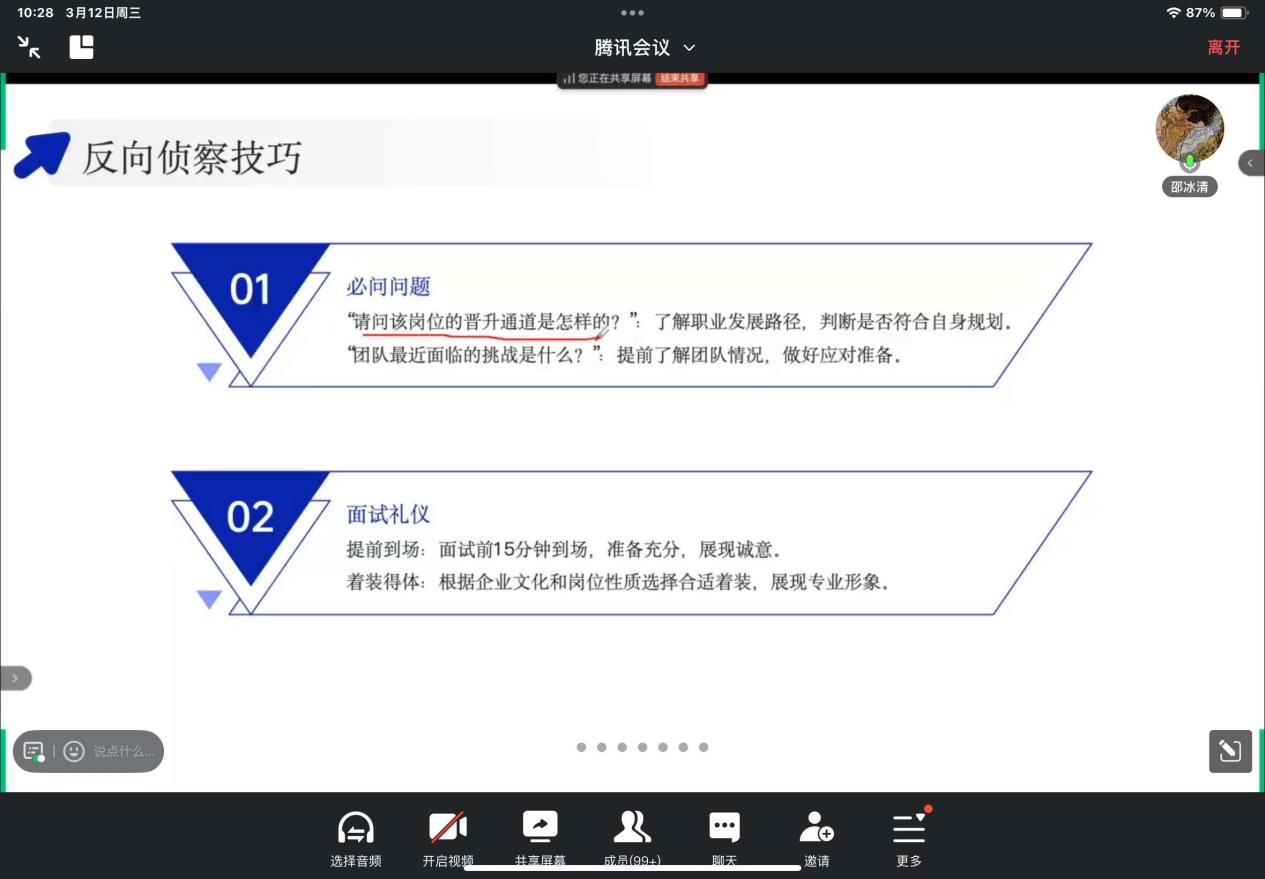 在毕业季的关键节点,为帮助毕业生们明晰就业方向、掌握求职要领,3 月 11 日和 12 日,万象城刘宇家老师和邵冰清老师精心筹备并开展了线上就业专题讲座,聚焦就业形势剖析与毕业生就业指导,吸引了众多同学热情参与。
