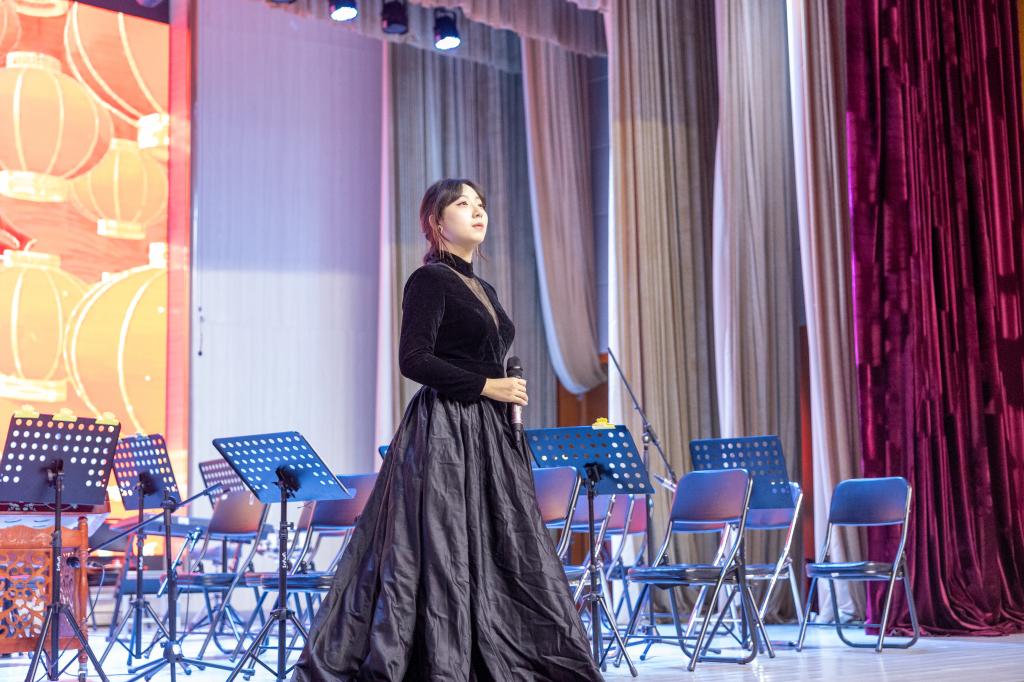 首先登场的是“星雨”民乐团带来的民族管弦乐合奏《太阳颂》。在柯晨老师的指挥下,开篇乐章以稳健有力的鼓声与激昂的旋律拉开序幕,生动地勾勒出太阳升起的壮丽景象。二胡的悠扬、琵琶的清脆、笛子的婉转、古筝的典雅、中胡的醇厚、大提琴与低音提琴的深沉以及大鼓小鼓的明快节奏相互交织,共同呈现出太阳的温暖与光辉。同师生们默契的配合和精湛的技艺,将每一种乐器所蕴含的独特音色与情感自然地融合,使整首曲子既彰显了中国传统音乐的独特韵味,也表达出太阳所蕴含的蓬勃生命力。