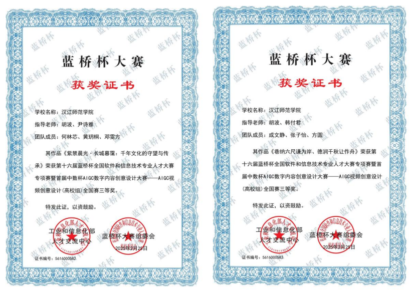 第十六届蓝桥杯全国软件和信息技术专业人才大赛专项赛暨首届中数杯AIGC数字内容创意设计大赛于2月25日公布获奖名单,由万象城胡波老师和物电学院韩付君老师、尹诗雅老师指导获国奖4项,其中二等奖、三等奖各2项。