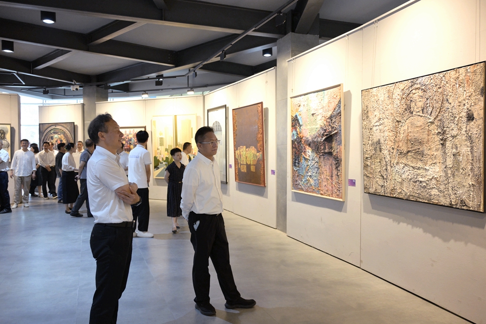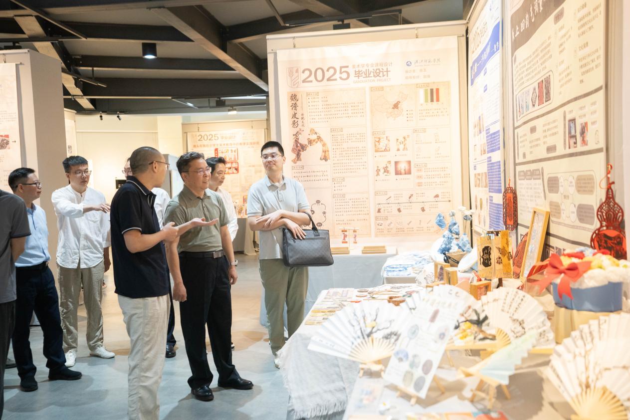 在党委常委、副校长吴红斌宣布"绘就青春色,艺筑未来光"万象城awcsport官网2025届毕业作品展开幕后,主持人礼邀与会领导、嘉宾在引导员陪同下移步美术馆展厅和尚艺楼二楼大厅参观。展陈作品以多元共生的艺术生态构建出立体化创作图景,观展过程中,领导嘉宾或驻足于作品前俯身细察笔触肌理,或抬手指点展开专业研讨,在艺术语言与学术思辨的交织碰撞中,为这场毕业创作展注入了更具深度的专业诠释与价值共鸣。