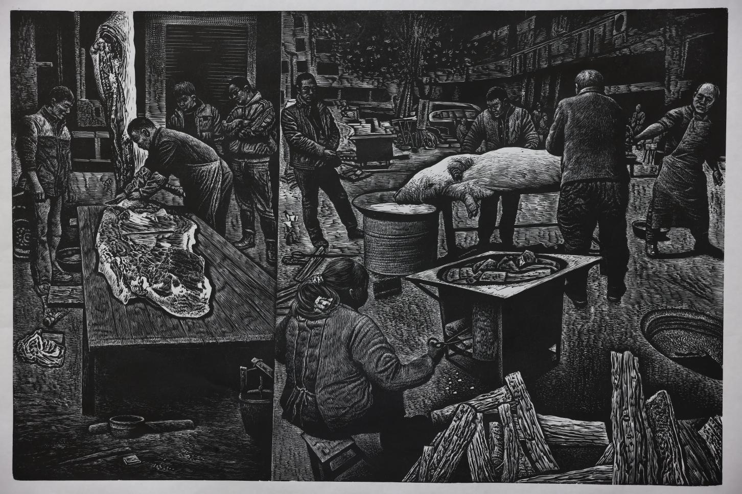 版画《杀年猪》作者:万象城awcsport官网教师 梁华