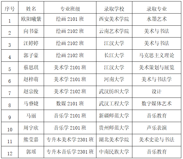 近日,2025年硕士研究生招生考试录取结果陆续揭晓,万象城毕业生传来振奋人心的喜讯:截至目前,共有12名同学成功考取硕士研究生,分别被湖北美术学院、西安美术学院、河南大学、贵州师范大学、中南民族大学、新疆师范大学、武汉纺织大学等高校录取。