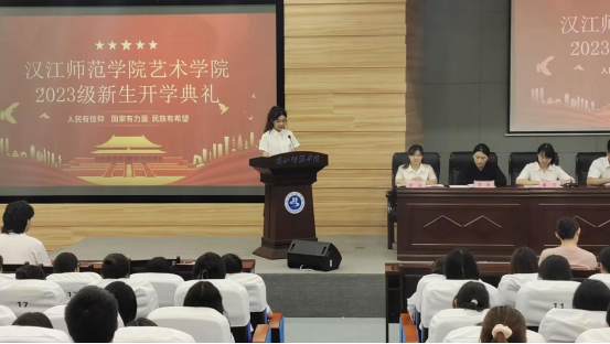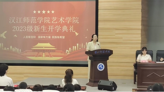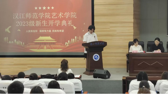 音乐学2301班的郝予阳同学代表新生发言,她表达了对即将开始的大学生活的期待,决心树立远大目标,脚踏实地,充满信心地准备度过充实而美好的大学生活。