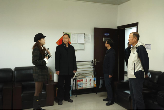 在主持人唐朝的指引下,考察组与十堰教育电视台台长助理马从兵,实习指导老师代表韩勇、刘沛先后参观了电视台各部门的办公环境以及融媒体中心、演播厅等系列设施并看望学院一线工作的实习生。