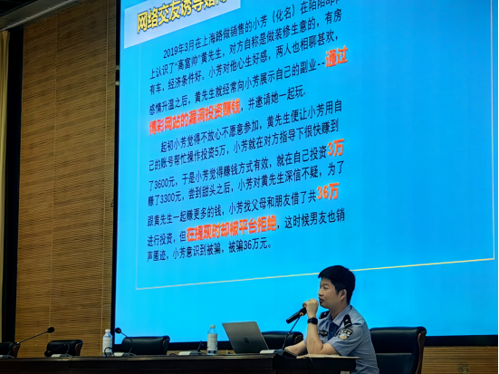 讲座邀请了十堰市人民路派出所案件中队长向瑶警官担任主讲嘉宾。向警官从辖区电诈警情形势及受害者分布、诈骗种类及诈骗步骤、诈骗甄别方法与手段三个方面,做了详细而全面的讲述。