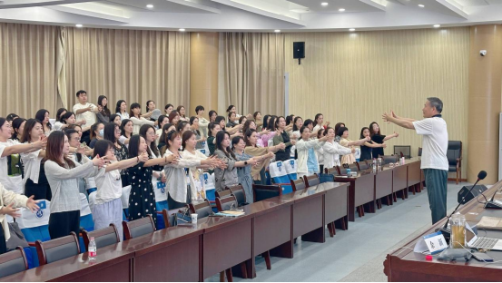 开班仪式后,北京教育学院教育干部学院,余新教授为武汉市中小学音乐老师们,带来了一场题为《义务教育课标理念下“以学生为本”的教学设计与体验》的精彩讲座。余教授深入剖析了新课标下的教学理念,强调“以学生为本”的核心,余新教授通过不同情境,互动的方式引导老师们明确学习的九大教学原则和五大障碍的破解策略,鼓励教师们要转变育人方式,在教学中注重学生的情感体验与参与,重构音乐课堂,让音乐课堂成为学生心灵的港湾。在讲解过程中,余教授还通过微信签到、倒水情境、食指交叉游戏等有趣的活动,把教学理论讲得深入浅出、生动有趣,让老师们在体验中理解、感受,老师们意犹未尽、收获满满。