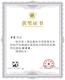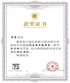 其中,22级音乐学专业刘子璇获综合师范院校本科生民族组“铜孔雀杯”、邓雅君获 “优秀奖”;青年教师曾霞获综合师范院校教师民族组“优秀奖”和“优秀指导教师奖”。