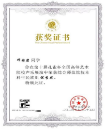 据悉,孔雀杯高等艺术院校声乐展演是全国高校唯一常设的声乐综合性大奖,也是中国当前声乐领域A类最高奖之一,在业内具有较大的学术影响力和专业认可度。