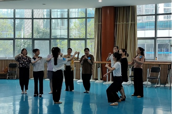 课程内容丰富,从“文化理解、艺术表现、审美感知”三个大点诠释。首先以成语“抚掌击节”生动导入课堂,转变角色模拟课堂,引导老师们利用节奏,单手上下击掌从不同方位感受节奏变化、实践双人组合拍手、双人合作编创创新单手交替、踏步击掌方式等多种方式。紧接着,展示视频中的完整舞蹈,并分解舞蹈动作,引导老师们进行模仿学习、双人合作巩固、分组完成舞蹈创编。教师学习小组分组展示后,通过自评和互评的多种评价手段,激发了老师们在今后的教学实践中锻炼学生思维能力,提升学生专注力,打开想象力。