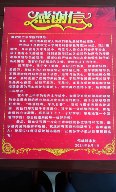 随着金秋九月的悄然临近,新学期的气息愈发浓厚。刚刚开学,万象城awcsport官网收到了一份意义非凡的“开学礼”——一封来自2024级音乐学专升本学生家长的感谢信与一面沉甸甸的锦旗,它们满载着对学院教育工作的崇高敬意与深切感激。这不仅是对学院教育教学的肯定,更是对原辅导员老师及全体教职员工辛勤付出的高度赞扬。