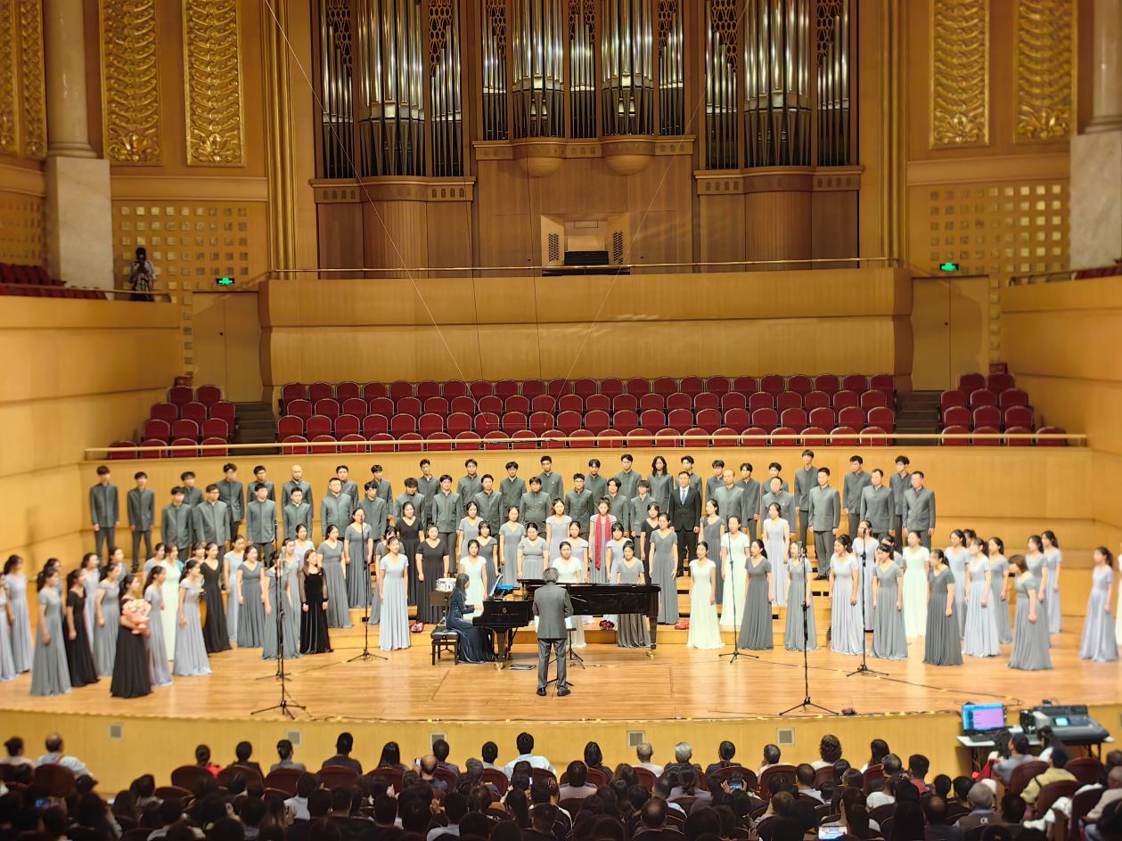 10月14日,“相约长江”合唱周特邀知名团队专场音乐会——Tiankong合唱团音乐会暨合唱周闭幕式在武汉琴台音乐厅举行,音乐会演唱了中外经典合唱作品16首,拾光合唱团20名学生参加《深爱的》《儿时》《城南送别》等作品的演唱。