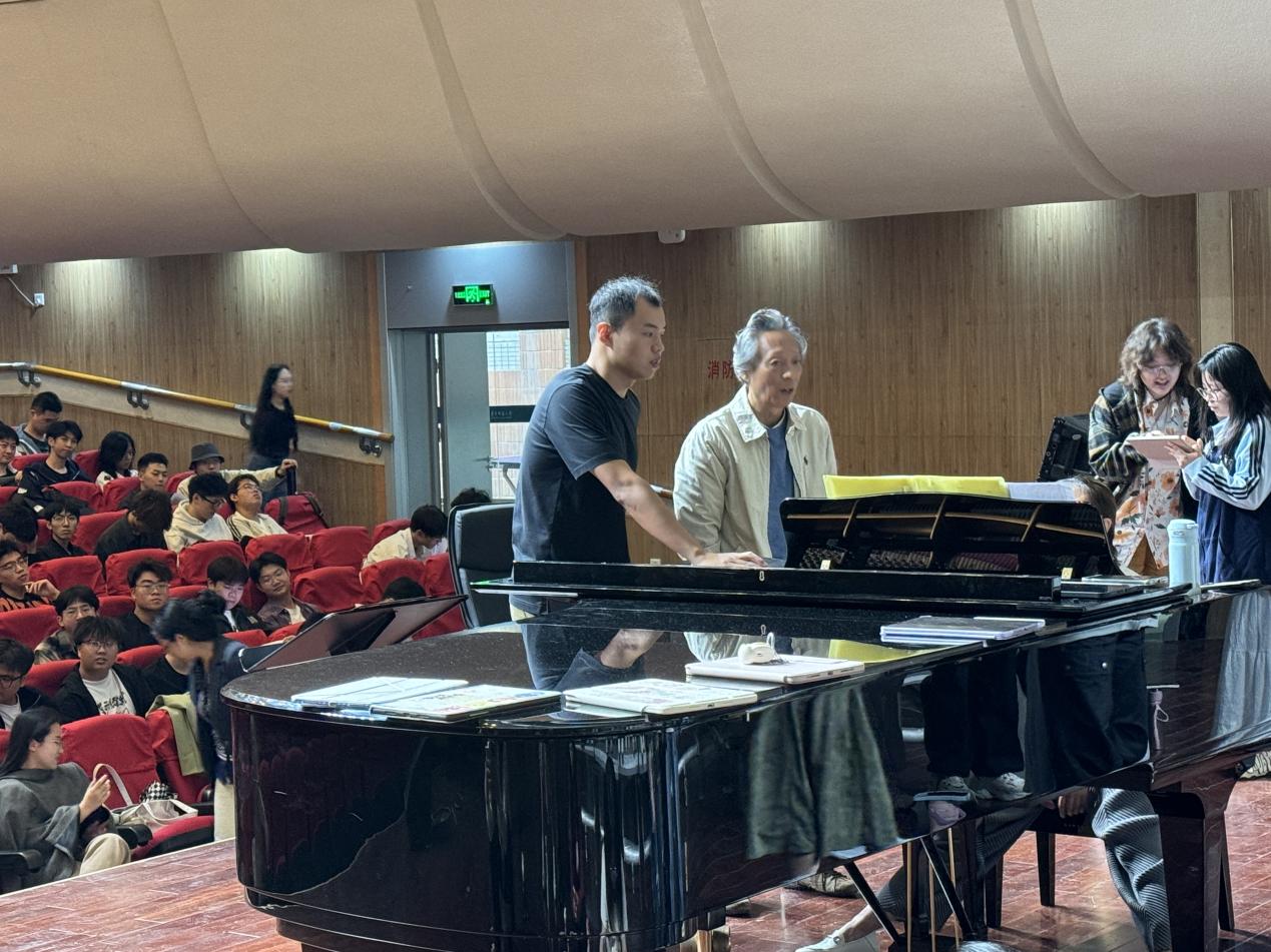 10月4日——10月13日,为落实教育部“师范教育协同提质计划”任务和要求,加强人才队伍建设和学科专业建设,王勇、邓欣闻老师及辅导员华雯雯老师携拾光合唱团66名学生赴华中师范大学参加了华中师范大学的文化名片、享有世界声誉的Tiankong合唱团的集中训练活动。观摩了哈萨克斯坦拜卡达莫夫合唱音乐会、合唱体验课、艺美大讲堂等活动。田晓宝教授更是在百忙之中抽出时间为拾光合唱团进行了排练、为两位老师进行了合唱指挥法的授课。