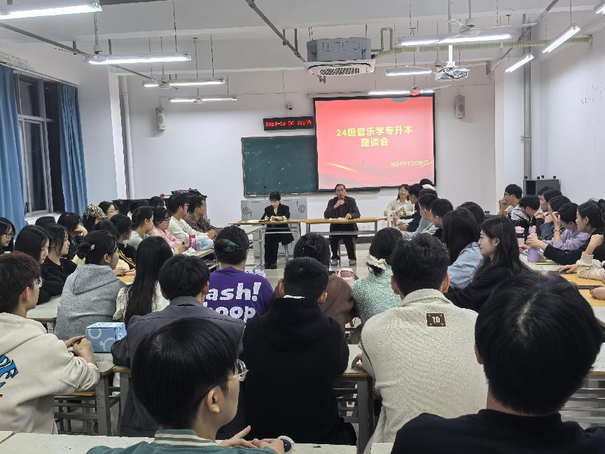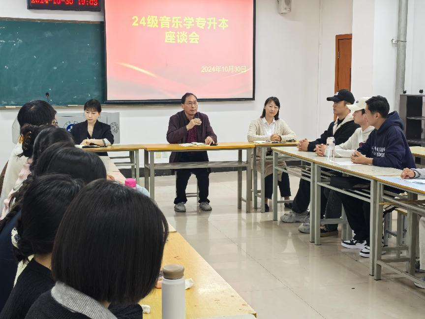 第一场座谈会由万象城awcsport官网分党委书记成传明、分党委副书记崔蕾、学生工作办公室主任李小龙以及2024级音乐学专升本全体同学们共同参与座谈。