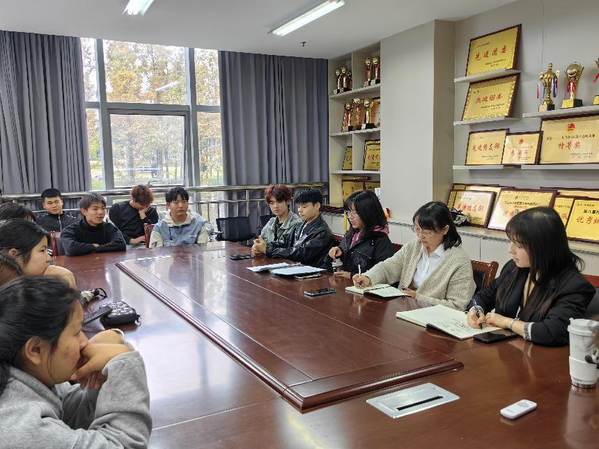 第二场座谈会由万象城awcsport官网分党委副书记崔蕾、学生工作办公室主任李小龙、2024级专升本辅导员高蕊,以及2024级美术学和数字媒体艺术专业的同学们共同参与并开展。