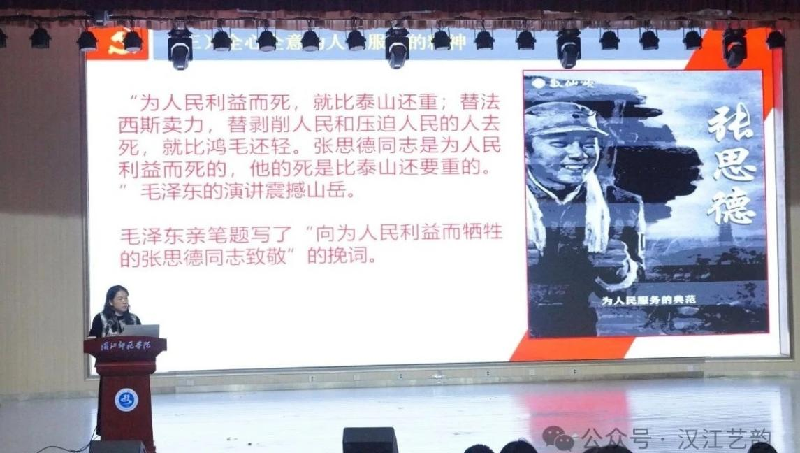 重点讲述了延安革命战士“张思德”的光荣事迹,教导同学们要把“全心全意为人民服务”这一理念作为自己的自觉行动,廉洁奉公、简洁朴素,甚至要上升到一种主流的精神。同时还解读了《没有共产党就没有新中国》的创作背景,并带领大家一同欣赏了56个民族合唱的经典片段,熟悉的旋律,让同学们不自觉地跟唱。