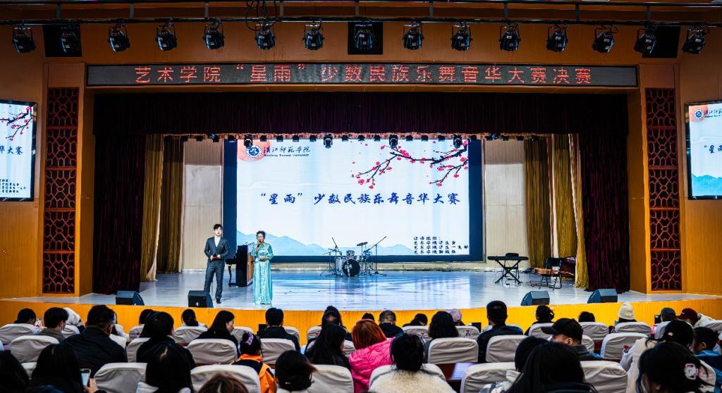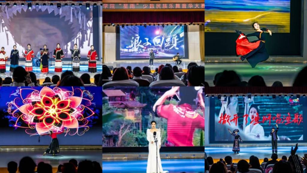 彝族歌曲《不要怕》率先登场,苏倩颍小组的同学们用热情的笑容和极具感染力的表演,瞬间点燃了现场气氛,仿佛将大家带到了风景宜人、淳朴善良的大凉山。潘耀辉在闵文博的吉他伴奏中演唱了独具特色的闽南语歌曲《浪子回头》,在演唱过程中,乐器的演奏与歌手的嗓音相互交融,彼此衬托,共同为歌曲增色不少,使整首歌曲更加饱满丰富。蒙古族舞蹈《原上草》在王婷婷的舞姿中将草原儿女的飒爽英姿以及豪迈奔放之情展现得淋漓极致。王元丽小组的壮族艺术歌曲《越人歌》,他们通过多声部对歌曲进行了完美的诠释,同时在陈李航的竹笛声中将壮族人民表达感情时的委婉含蓄表现得恰到好处。维吾尔族歌舞《楼兰少女》在潘佩婀娜多姿的表演尽显绚丽多彩。邓雅君独唱的土家族民歌《门前一口堰》将土家人的醇厚质朴表达的栩栩如生。刘嘉宇、何珊珊深情对唱的《壮族山歌》,将壮族人民最真挚最热情的祝福带给了全场观众,也将比赛氛围推向高潮。梁境纹小组演绎的扬琴重奏《喜讯》热情奔放,清脆悦耳的音符交织成美妙旋律,令人回味无穷。来自藏族的姑娘边珍更将自己民族的歌曲《天上的仙女》唱响全场,引得阵阵掌声。李秋旻独唱的《一杯美酒》以其醇厚甜美的嗓音、灵动活泼的演唱风格,将歌曲中维吾尔族少女对爱情的炽热向往与对生活的欣然陶醉完美诠释。赵吉睿用葫芦丝一气呵成将白族音乐《篝火狂欢夜》表现得热情奔放,她用自己高超的技艺收获了全场呐喊声。傣族音乐合奏《欢乐的泼水节》更是备受瞩目,其中笙演奏者汪国进以其精湛技艺为作品增色不少。