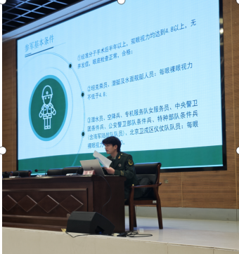 会上,24 级专升本的四位退伍大学生担任主讲嘉宾,他们分别来自不同军种,陆军的樊涛、空军的金晨、火箭军的何宜彦以及武警部队的石明家依次宣讲。他们结合自身独特的军旅经历,生动地讲述了在军队中的日常训练、执行任务以及成长蜕变的故事,分享了这段经历为他们带来的坚毅品格和广阔视野。同时,他们还详细解读了征兵政策的各个方面,从报名条件的精准阐释,到入伍待遇的清晰说明,再到退伍安置的全面介绍,为参会学生呈现了一套完整且详细的参军信息指南,让学生们对军旅生涯的规划有了更为清晰的认知。