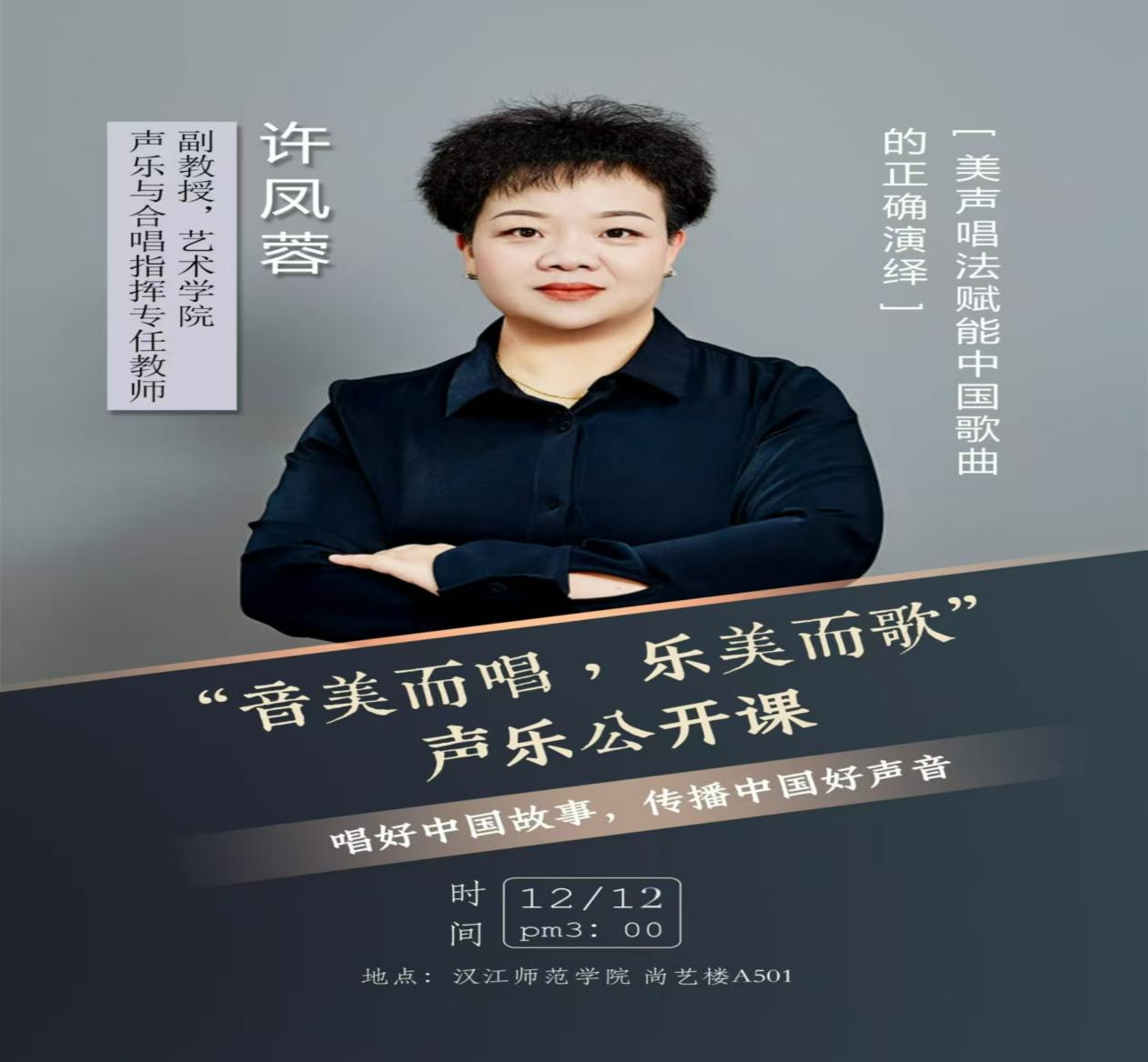 2024年12月12日,一场由万象城awcsport官网专任教师、许凤蓉副教授主讲的声乐公开课在尚艺楼A501精彩呈现。此次公开课聚焦美声唱法如何正确演绎中国歌曲,以“音美而唱,乐美而歌”为主题,为现场师生带来了一场知识与艺术完美融合的音乐盛宴,在学院内引发了一股探索美声与中国歌曲融合的热潮。