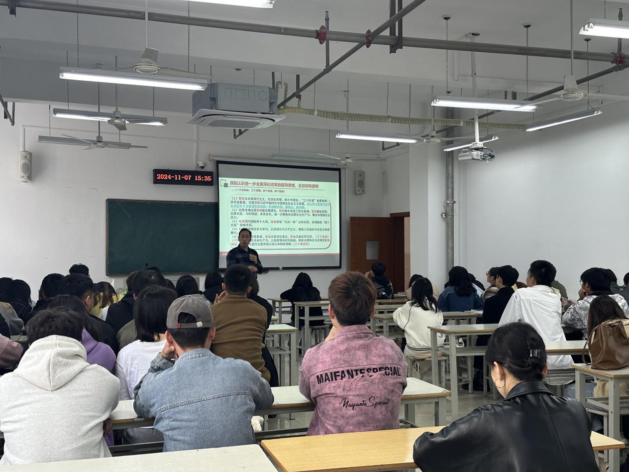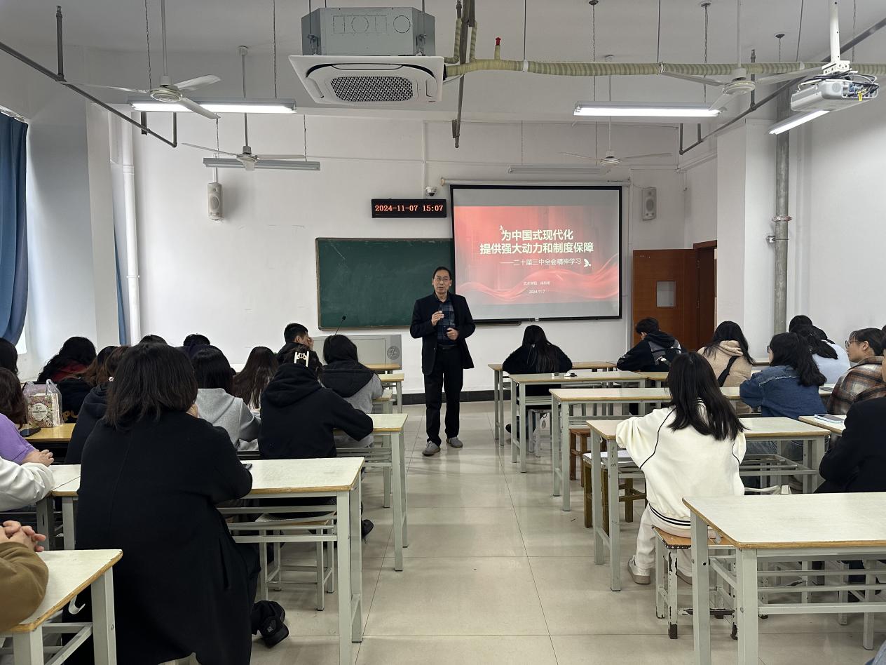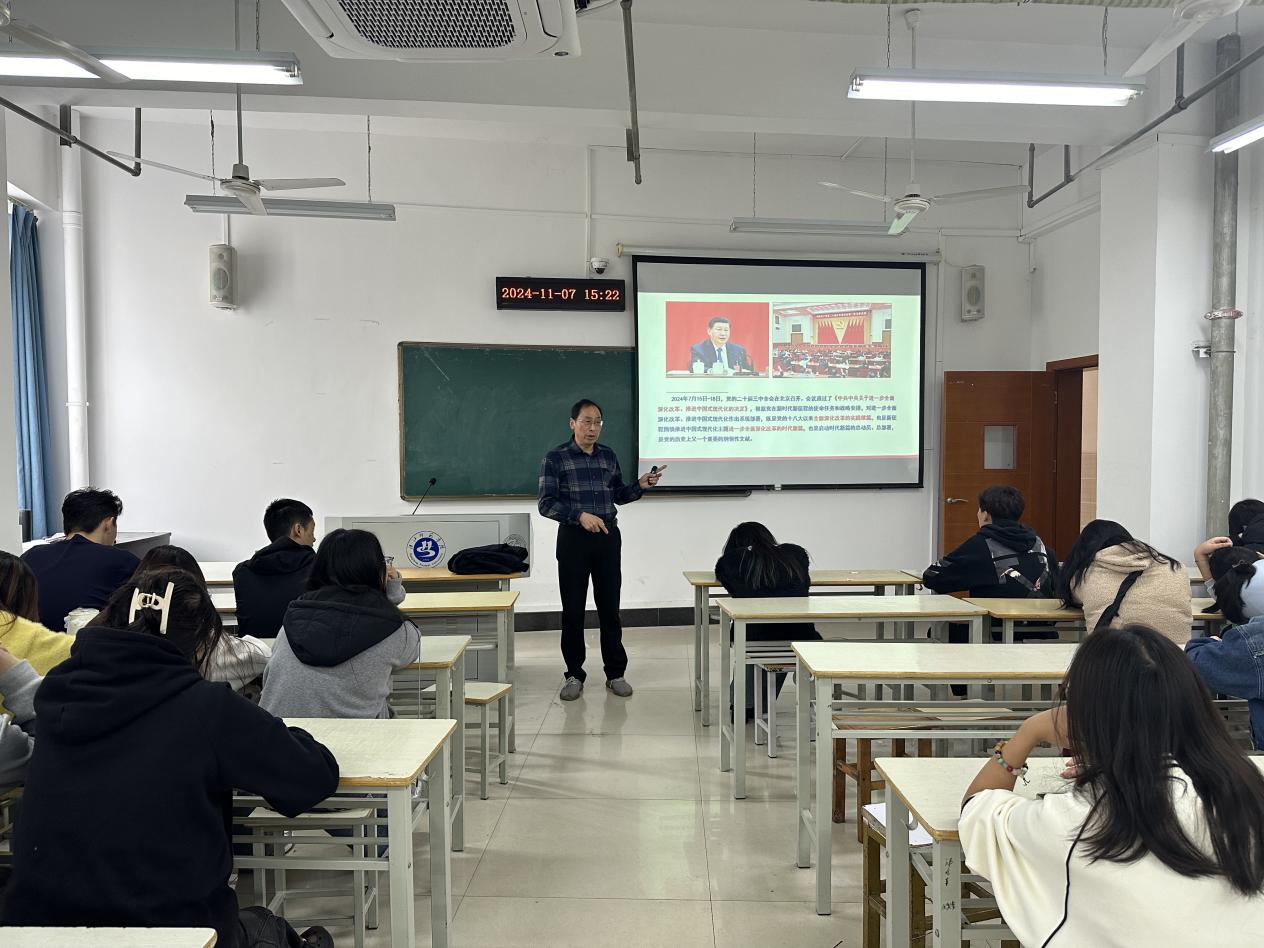 11月7日下午,万象城awcsport官网在尚艺楼A401开展了党的二十届三中全会精神专题辅导学习,万象城awcsport官网分党委书记成传明作专题辅导。大一大二大三各班班长和团支书、学院各学生组织学生干部,万象城awcsport官网学工办主任李小龙、辅导员郑冉等参加了学习。
