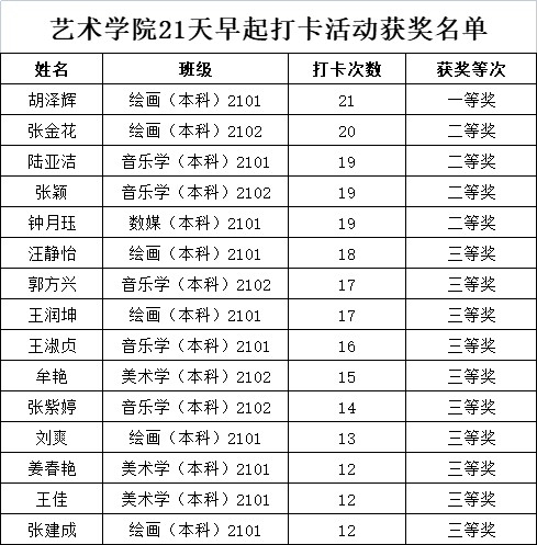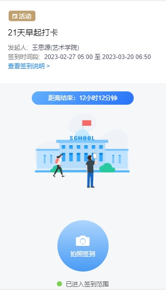 2月27日,学院辅导员利用“今日校园App”,开启了“21天早起打卡活动”,每天早上5:00-6:50为早起打卡时间段,先从2021级学生开始实施,后期将会从全院发起“早睡早起倡议”,督促学生养成良好的生活习惯,从而促进同学们形成良好的学习习惯,进一步强化班风学风建设,创建“文明宿舍”“文明班级”,爱校荣校,为学校本科教学工作合格评估争做贡献。