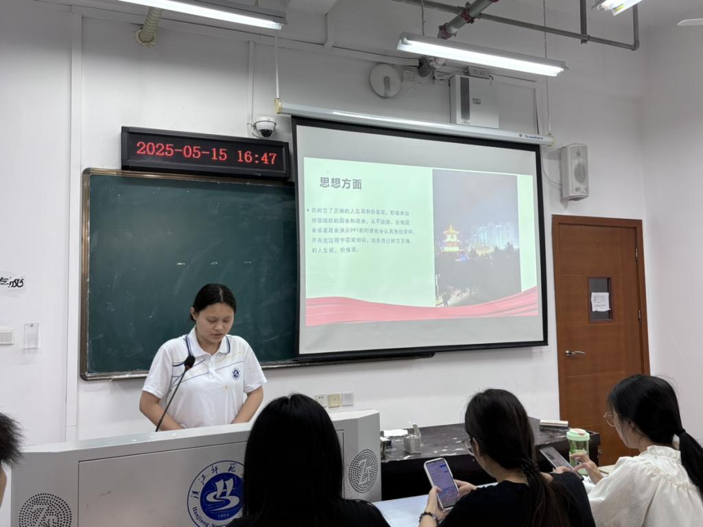 随后,角逐“诚信之星” 的黄惠同学通过PPT 全景式展示了自己在 “思想铸魂、学风建设、竞赛承诺、生活纪实、实践育人” 五大维度的坚守与成果。
