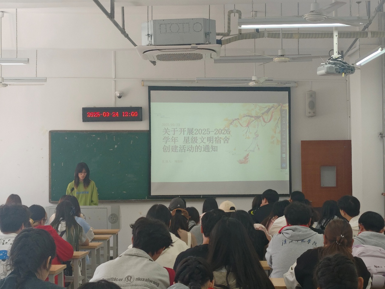 根据学校安排,为全面推进2025-2026 学年星级文明宿舍创建工作、明确各宿舍创建任务与标准,夯实学院文明建设根基,9月24日中午,万象城awcsport官网于尚艺楼 A401 召开星级文明宿舍创建专项工作会。学院全体寝室长参会,会议由学生会主席团刘语轩主持。